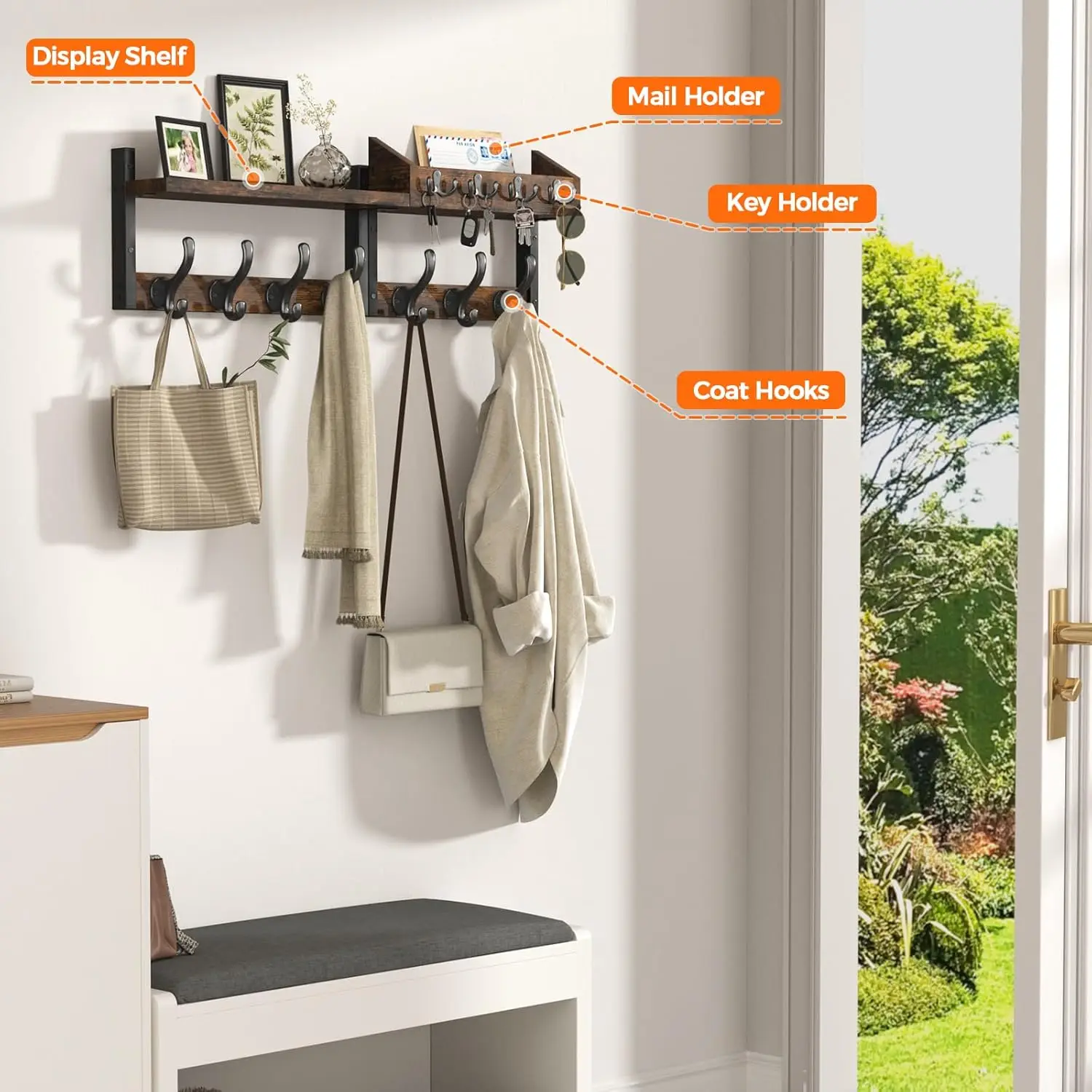 **Transform Your Entryway with Smart Organization** Keep your living space tidy and well-organized with this versatile wall-mounted coat rack. Designed to maximize vertical storage while adding functional elegance to any room. **Key Features:** • **Multi-Functional Design**: Combines coat hanging, key storage, mail organization, and display shelf in one compact unit. Perfect for storing jackets, bags, hats, leashes, and everyday essentials. • **Ample Storage Capacity**: Features 11 durable metal hooks including 7 reinforced coat hooks and 4 dedicated key hooks. The spacious top shelf provides additional space for decorative items or small necessities. • **Premium Construction**: Crafted from high-quality wood and metal materials ensuring long-lasting durability. The sturdy build can reliably hold heavy coats, purses, towels, and various household items. • **Space-Saving Solution**: Measuring 29" x 8" x 4.5", this organizer maximizes wall space without occupying floor area. Ideal for entryways, hallways, bedrooms, living rooms, offices, or mudrooms. • **Easy Installation**: Equipped with dual-hole mounting system for enhanced stability and straightforward installation on any wall surface. • **Versatile Style Compatibility**: The rustic brown finish complements various decor styles including modern, farmhouse, rustic, and contemporary interiors. Adds warmth and character while maintaining practical functionality. **Perfect For:** - Keeping entryways clutter-free and organized - Storing daily essentials within easy reach - Small apartments and compact living spaces - Creating an inviting first impression in hallways - Adding both style and utility to any room The combination of thoughtful design and robust construction makes this wall organizer an excellent addition to any home seeking better organization solutions.