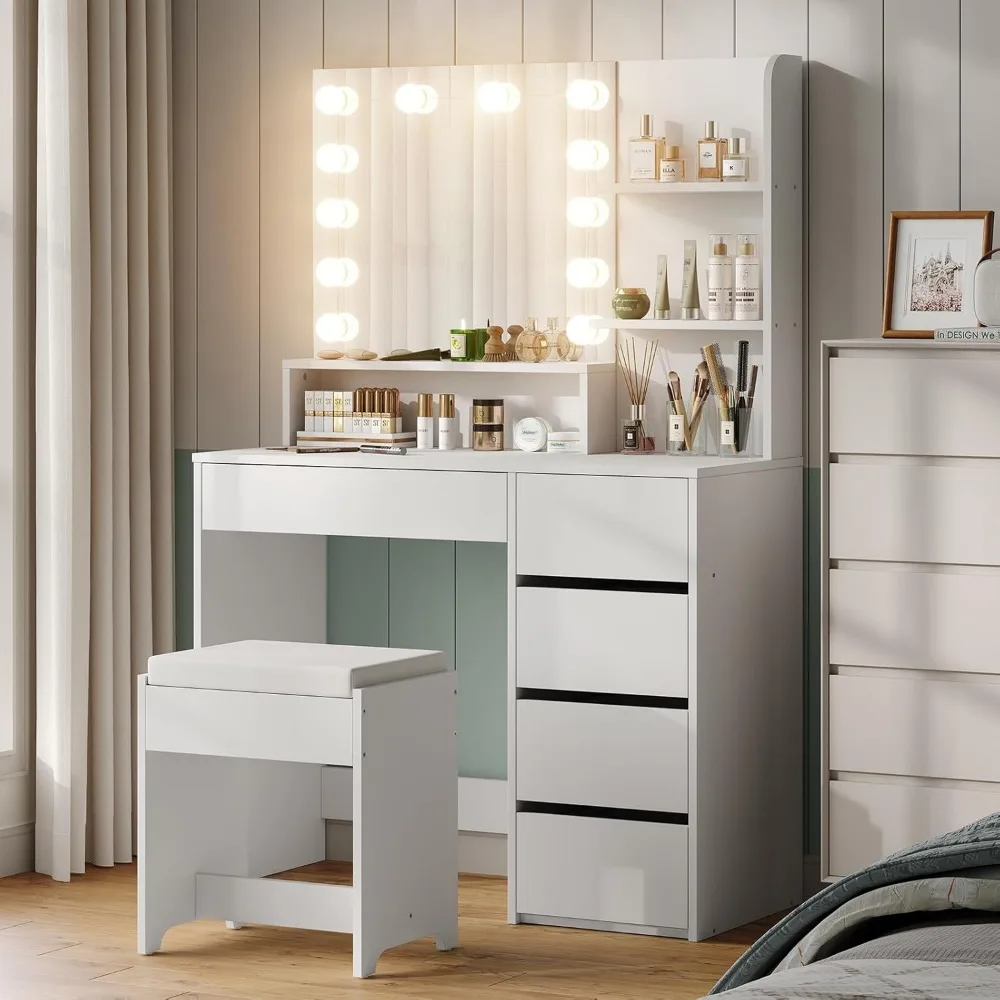 This versatile vanity desk is equipped with 5 spacious drawers, providing ample storage for all your beauty essentials, accessories, and personal items. The adjustable brightness feature on the illuminated vanity mirror ensures you achieve perfect lighting for makeup application, regardless of the time of day.