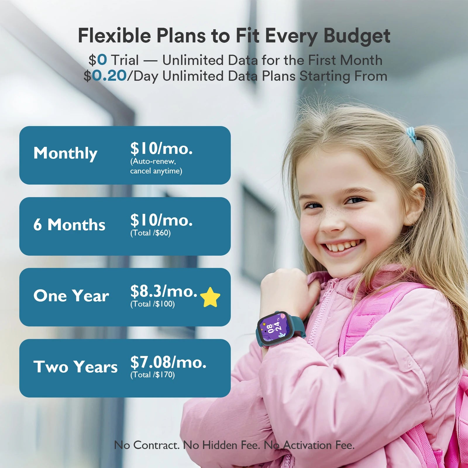 Included in the box: Kids Watch, Watch Band, Case & Lanyard, Charging cable, SIM Eject Tool