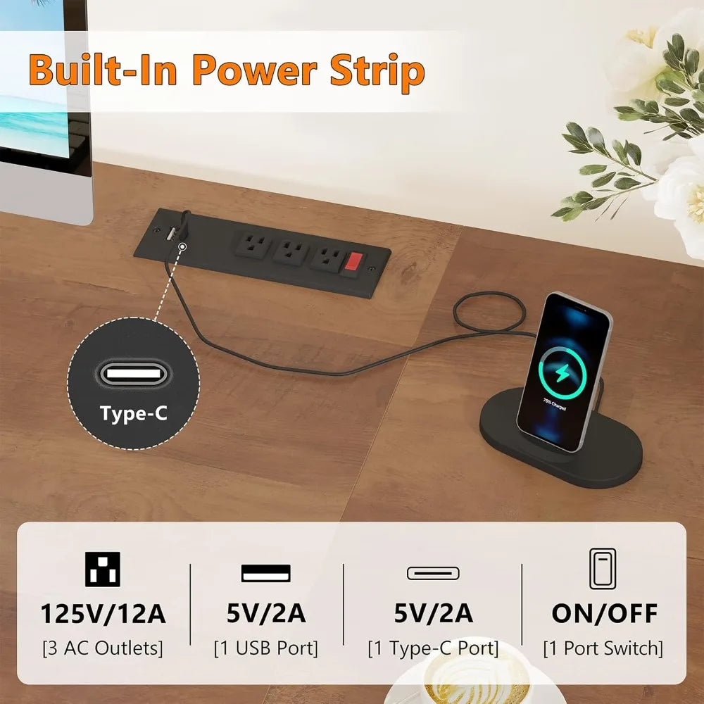 Transform your workspace with this versatile 60-inch computer desk designed for productivity and style. Featuring 8 fabric drawers—four on each side—this desk offers ample storage for books, files, office supplies, headphones, and more. The lightweight drawers glide smoothly, keeping your essentials organized and within reach. Stay powered up with the integrated power strip, which includes 2 USB ports and 2 AC outlets. Charge your laptop, tablet, phone, or gaming devices seamlessly without cluttering your desk with extra cords. Perfect for home offices, study areas, or gaming stations. Crafted from high-quality MDF board with a scratch-resistant and waterproof finish, this desk is built to last. The sturdy metal frame ensures stability during intense work or gaming sessions. An X-bar support on the back and adjustable feet provide additional balance on any floor surface. The elegant design combines a brown wood-grain desktop with a white body, adding a modern touch to any room. With dimensions of 59.8"W x 18.9"D x 29.3"H (approx.), it fits comfortably in small spaces while offering generous legroom. Assembly is straightforward thanks to labeled parts and included tools with clear instructions. If you have questions about setup or usage, our customer support team is ready to assist. Ideal for remote workers, students, gamers, or anyone seeking a functional and stylish desk solution.