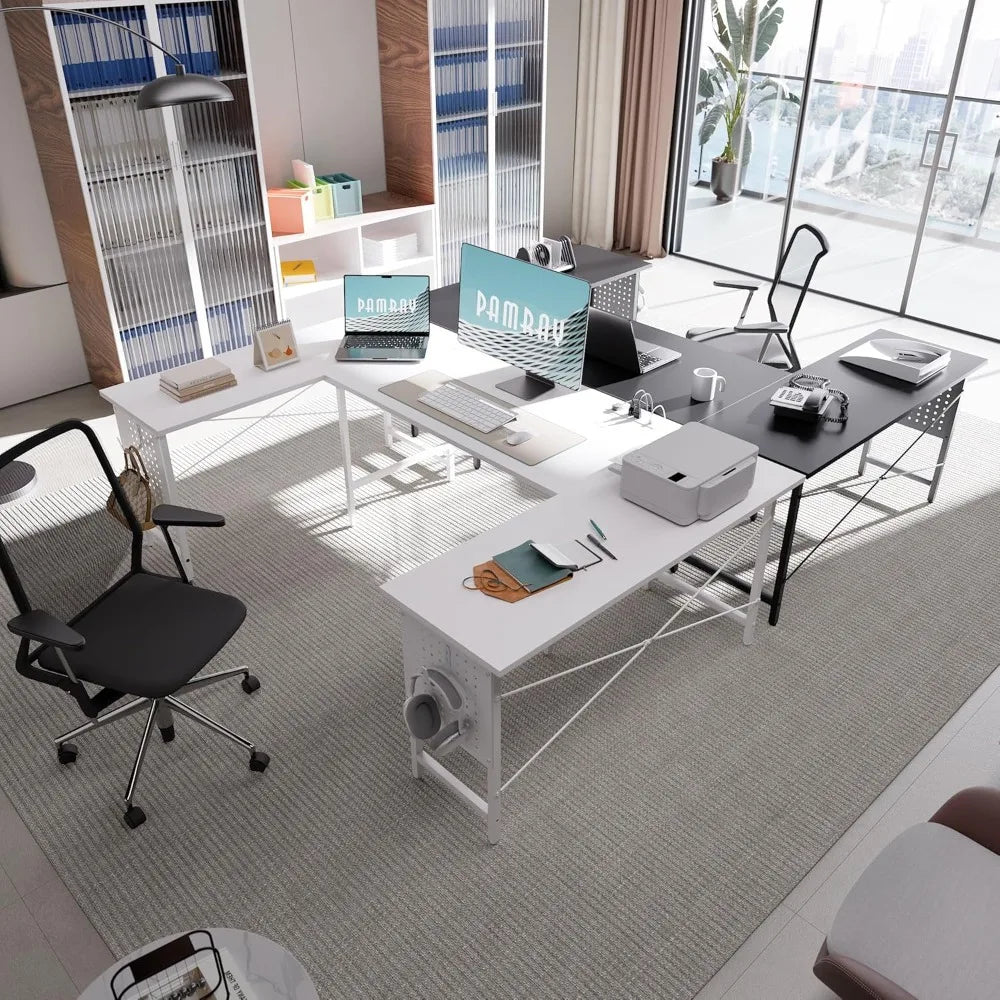 Transform your workspace with our spacious 71-inch U-shaped corner desk, designed to maximize efficiency and comfort for home office tasks, gaming, and creative projects. This versatile desk features three desktops, allowing you to organize separate zones for work, gaming, and writing—perfectly utilizing room corners to save space while providing ample surface area. Key features include integrated power management with 4 AC outlets and 2 USB charging ports, enabling you to conveniently charge laptops, phones, gaming consoles, and other devices without cluttering your setup. Built for durability and stability, the desk is reinforced with three X-shaped back braces and a robust steel frame that supports up to 150 lbs. Adjustable leg pads ensure a level surface on uneven floors. Assembly is hassle-free with clear instructions, all necessary tools included in the accessory box, and comprehensive installation videos accessible via QR code on the packaging. Choose from eight stylish colors—black, white, pink, gray, marble pattern, orange vintage finish (distressed look), or red—to seamlessly match any interior decor. Ideal for professionals seeking an organized home office solution or gamers needing a dedicated station. Elevate your productivity and style today!