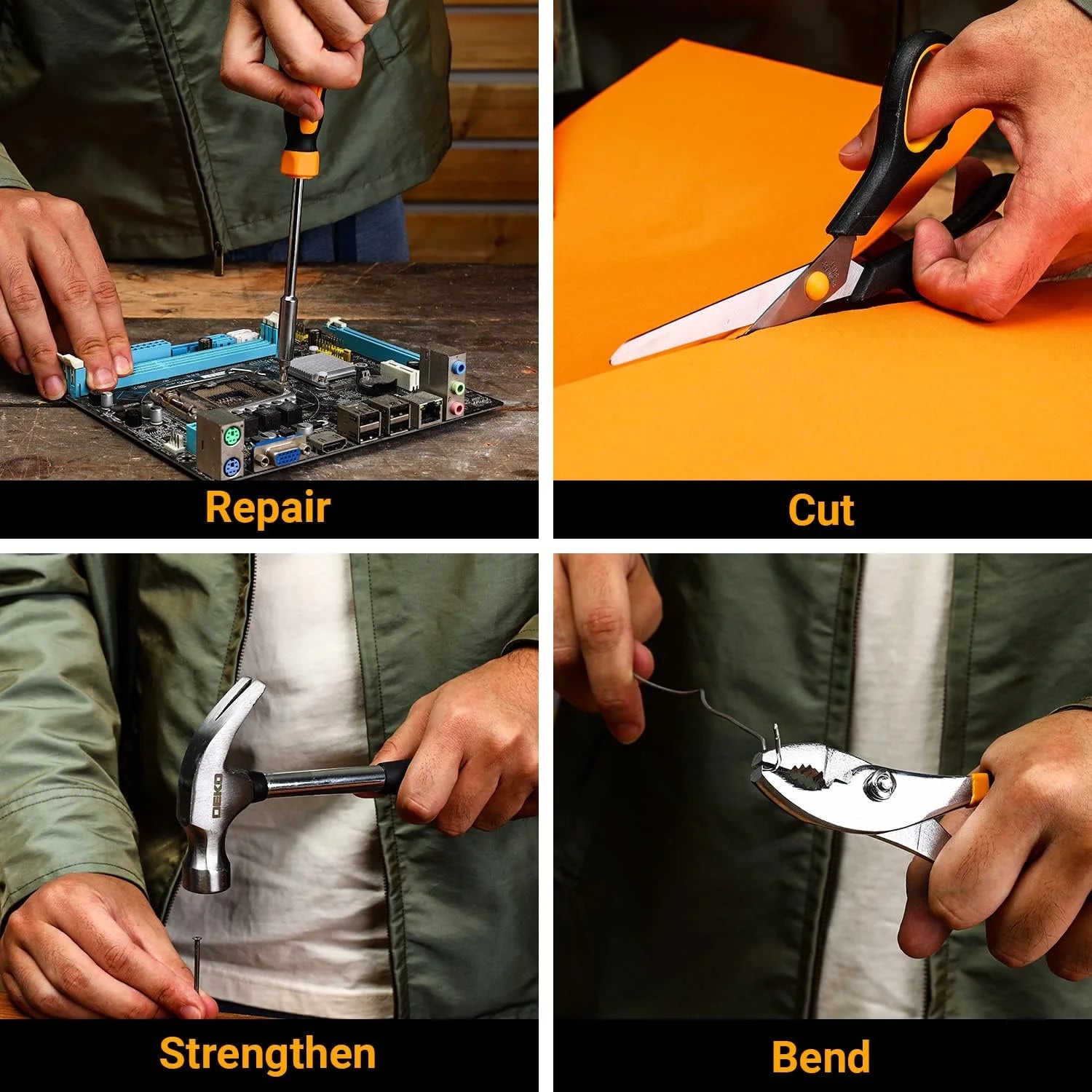 INCLUDES::8pcs professional-grade hex key wrenches, slip joint pliers, 30pcs bits, bits screwdriver, 4pcs precision screwdrivers, utility cutter, box fasteners, 3m measuring tape, scissors, claw hammer and magnetic bits holder.