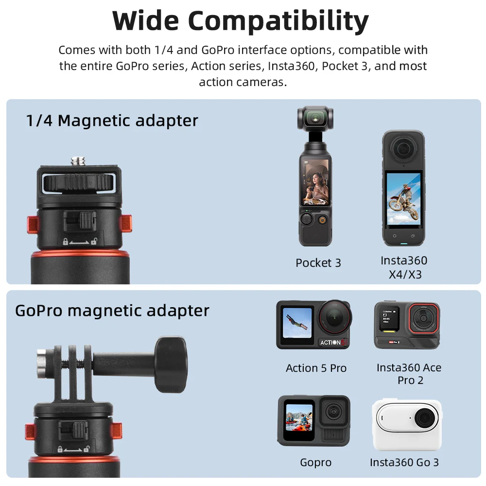 Includes both a for GoPro-style magnetic adapter and a standard 1/4-inch magnetic adapter. This allows you to quickly switch between compatible action cameras and other devices like smartphones, offering flexibility for different shooting scenarios