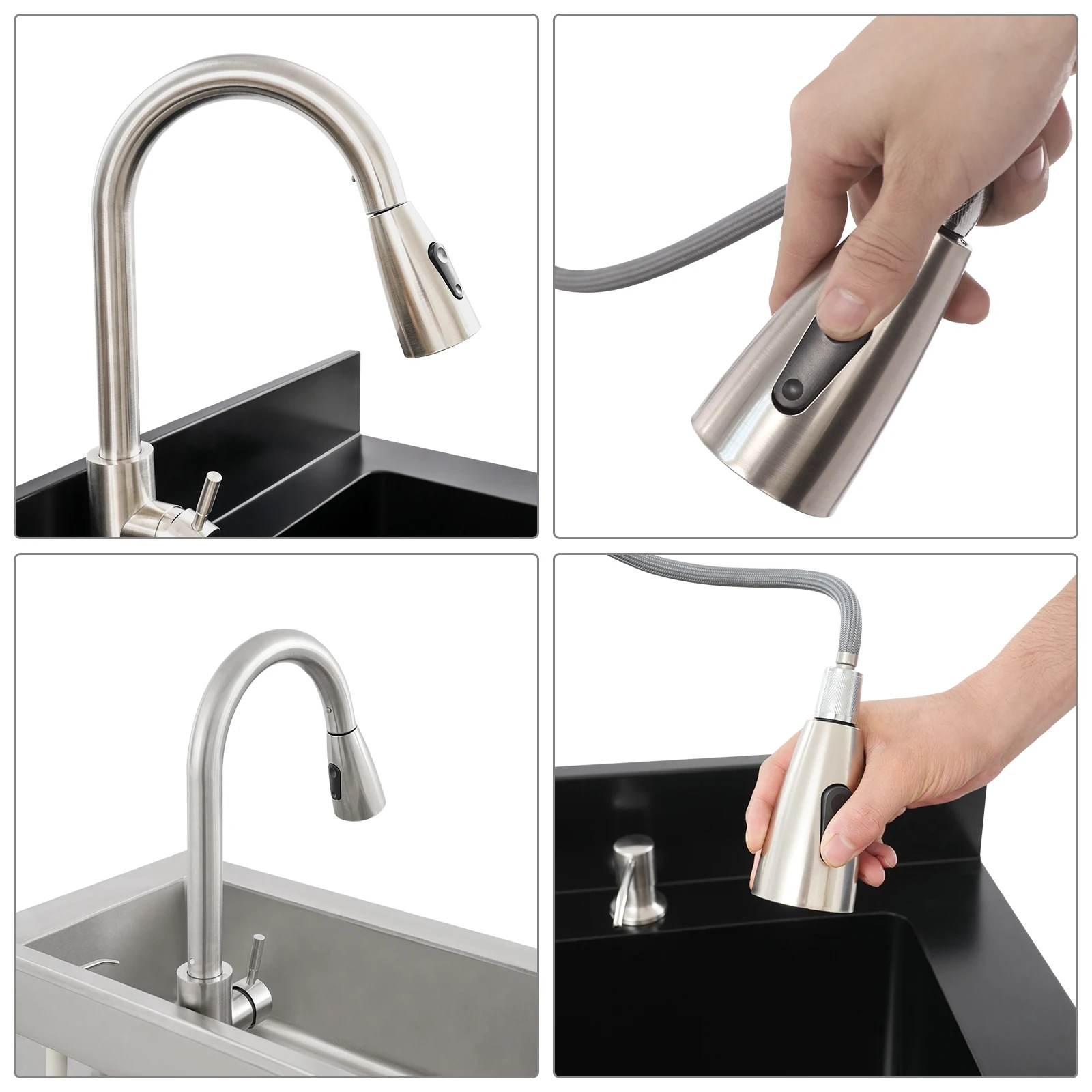 Kitchen Assistant: Equipped with a pull-out faucet that can rotate 360 degrees, it offers hot and cold water options and can switch between 2 water modes(shower mode, and sparkling water mode) at the touch of a button, allowing you to make your kitchen work more flexible and personalized. The lower shelf holds some cleaning items securely. The draining basket can not only efficiently drain washed vegetables and plates, but also provides a temporary resting place for various tableware, keeping the kitchen space in an orderly manner.