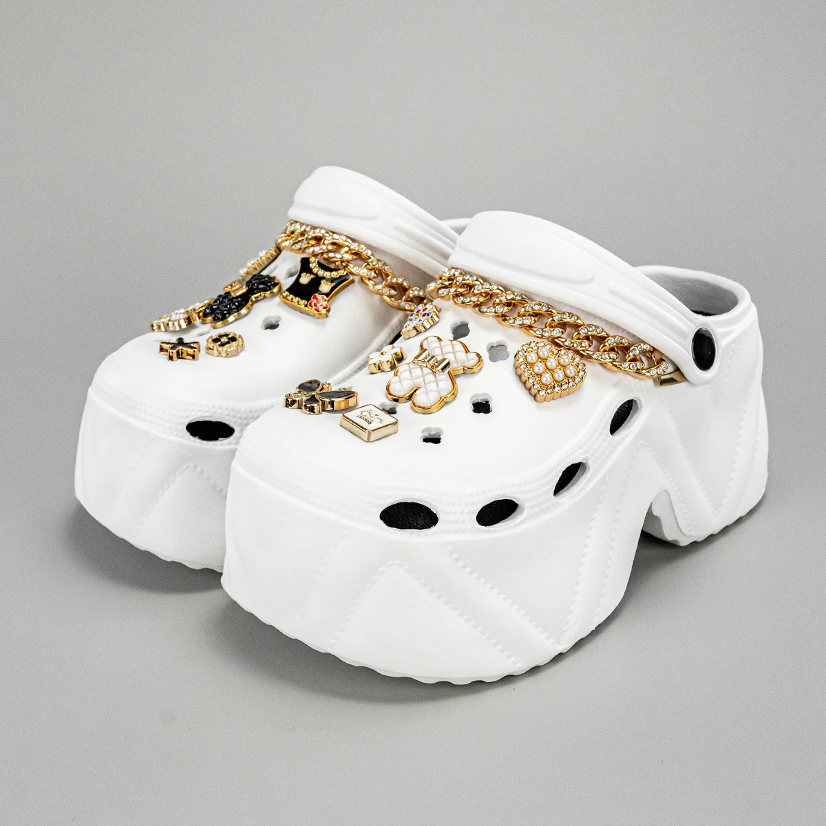 Step into style and comfort with our New Fashion Chain Black and White Bear High Heel Imitation Leather Pattern Clogs X8809. These stunning clogs are not just footwear; they are a fashion statement that enhances your wardrobe with a playful yet chic vibe.