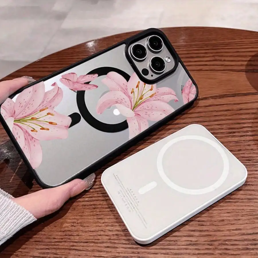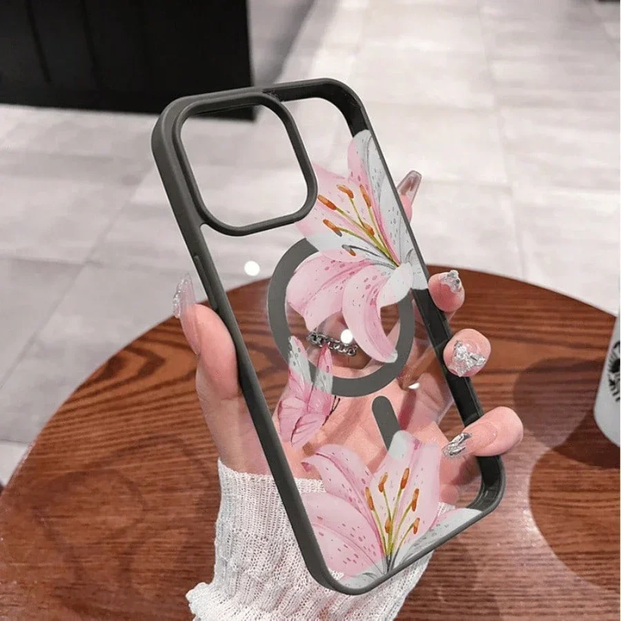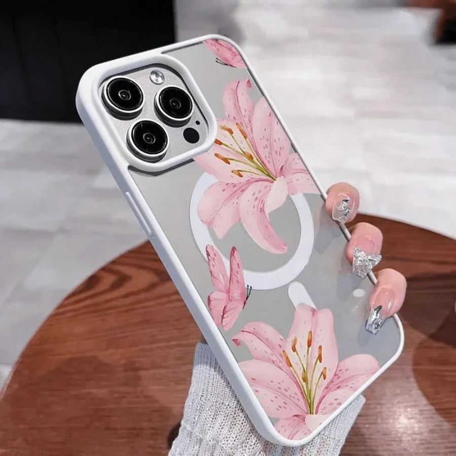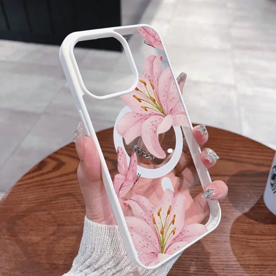 Pink Lily Magnetic Phone Case For iPhone 17 16 15 14 13 12 11Pro Max Plus It features a stylish pattern design