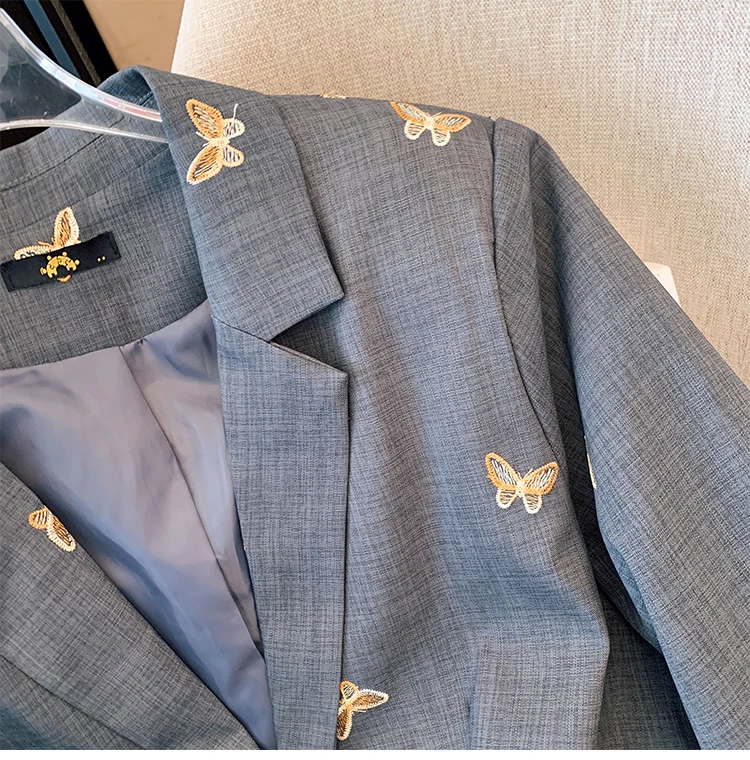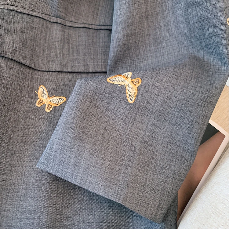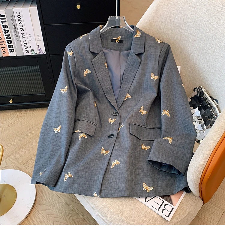 The light gray color serves as a versatile backdrop for any outfit, making it easy to pair with your favorite jeans or dresses. The butterfly embroidery adds a unique, artistic flair, transforming a simple coat into a statement piece.